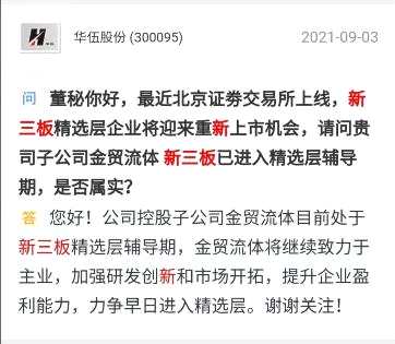 【華伍股份(300095)、股吧】(300095)回復(fù)控股子公司金貿(mào)流體目前處于新三板精選層輔導(dǎo)期,力爭(zhēng)早日進(jìn)入精選層。