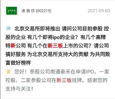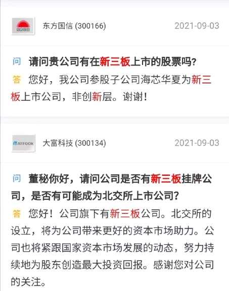 北交所設(shè)立消息9月2日晚宣布以來(lái),持續(xù)成為投資者關(guān)注的焦點(diǎn),不斷有投資者在滬深上市公司互動(dòng)平臺(tái)詢問(wèn)涉北交所和新三板情況,至記者發(fā)稿又新增至少10家公司答復(fù)相關(guān)信息。