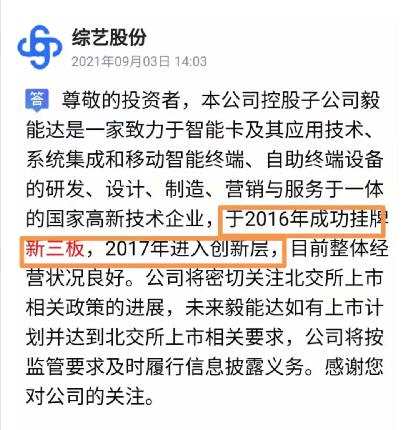 【綜藝股份(600770)、股吧】(600770)表示控股子公司毅能達(dá)于2016年掛牌新三板,2017年進(jìn)入創(chuàng)新層,目前經(jīng)營(yíng)情況良好。