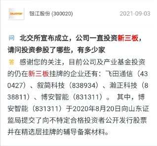 銀江股份(300020)稱公司及產(chǎn)業(yè)基金目前持有飛田通信、博安智能等4家新三板公司,其中博安智能8月20日提交精選層掛牌輔導(dǎo)備案材料。