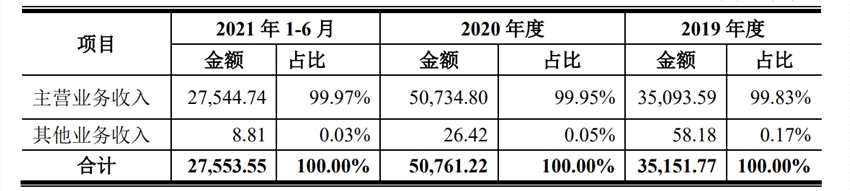 公告顯示,2019-2020年及2021年1-6月,天璣智谷營(yíng)業(yè)收入分別為3.52億元、5.08億元和2.76億元,其中主營(yíng)業(yè)務(wù)收入分別為3.51億元、5.07億元和2.75億元,占營(yíng)業(yè)收入比例分別為99.83%、99.95%及99.97%,主營(yíng)業(yè)務(wù)突出,營(yíng)業(yè)收入結(jié)構(gòu)總體保持穩(wěn)定。此外,報(bào)告期內(nèi),天璣智谷研發(fā)費(fèi)用分別為1073.61萬(wàn)元、1552.99萬(wàn)元和505.33萬(wàn)元,占營(yíng)業(yè)收入比重分別為3.05%、3.06%和1.83%。