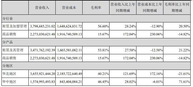 居然之家主要從事的行業(yè)分為租賃及加盟管理和商品銷售。其中,租賃及加盟管理上半年營收為37.99億元,同比增長28.24%;營業(yè)成本為16.49億元,同比下滑12.90%;毛利率為56.60%,同比增長20.50個百分點。商品銷售上半年營收為22.73億元,同比增長172.04%;營業(yè)成本為19.17億元,同比增長230.06%;毛利率為15.67%,同比下滑14.82個百分點。