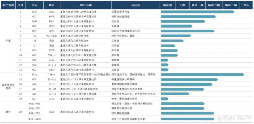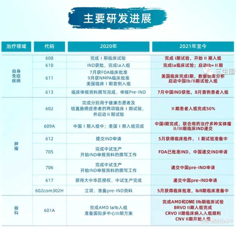 目前,三生國(guó)健擁有處于不同開(kāi)發(fā)階段的20個(gè)主要在研抗體藥物(包括12個(gè)處于臨床及臨床后階段的在研藥物、8個(gè)處于臨床前階段的在研藥物),涵蓋腫瘤、自身免疫及眼科等疾病領(lǐng)域,其中大部分在研藥物為治療用生物制品1類(lèi)或單克隆抗體,部分在研藥物為中美雙報(bào)。截至今年6月30日,三生國(guó)健共擁有專(zhuān)利權(quán)69項(xiàng),較去年年底新增4項(xiàng)。