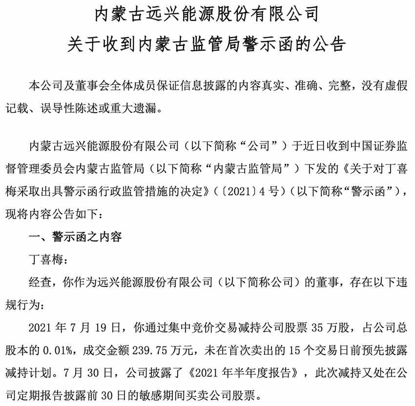 9月6日晚間,證監(jiān)會對遠(yuǎn)興能源發(fā)布警示函:7月19日,公司高管丁喜梅在未公告預(yù)先披露減持計劃的情況下,通過集中競價交易減持公司股票35萬股,成交金額239.75萬元。