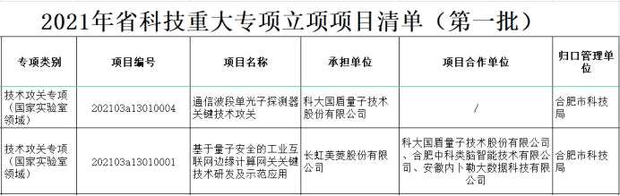 國(guó)盾量子兩項(xiàng)目入選安徽省科技重大專(zhuān)項(xiàng)