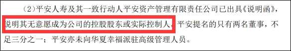 除此之外,平安人壽及其一致行動人平安資產(chǎn)管理有限責任公司已出具《說明函》,說明其無意愿成為華夏幸福的控股股東或?qū)嶋H控制人。