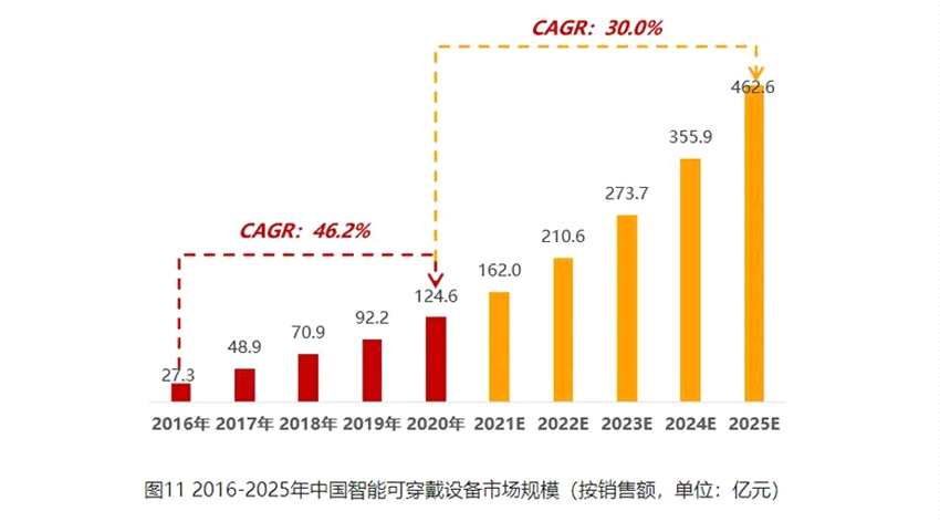 從發(fā)展?jié)摿ι蟻砜?,智能可穿戴設(shè)備在醫(yī)療領(lǐng)域的優(yōu)勢逐漸凸顯,中國的醫(yī)療器械企業(yè)顯露出了越來越迅猛的勢頭。據(jù)報告顯示,中國醫(yī)用級智能可穿戴設(shè)備行業(yè)保持高速增長態(tài)勢,市場增速高于行業(yè)整體水平。數(shù)據(jù)顯示,2016-2020年中國醫(yī)用級智能可穿戴設(shè)備市場規(guī)模復(fù)合增長率為46.2%,其中,2020年醫(yī)用級智能可穿戴設(shè)備市場規(guī)模為124.6億元,同比增長35.1%。目前,中國醫(yī)用級智能可穿戴設(shè)備已結(jié)束野蠻生長,開始迎來精細(xì)發(fā)展時代。預(yù)計2020-2025年中國醫(yī)用級智能可穿戴設(shè)備市場規(guī)模復(fù)合增長率達(dá)30.0%,2025年中國醫(yī)用級智能可穿戴設(shè)備市場規(guī)模將達(dá)462.6億元。
