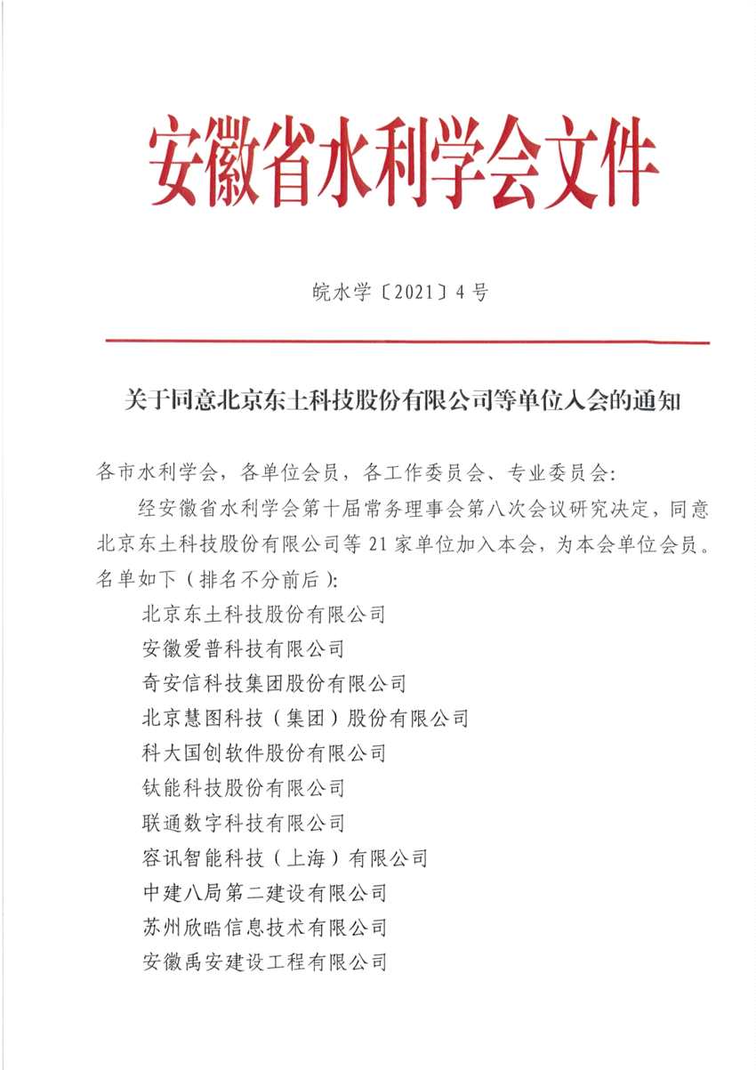 9月6日,安徽省水利學(xué)會(huì)(以下簡(jiǎn)稱學(xué)會(huì))正式下發(fā)通知文件,東土科技(300353)作為21家單位的企業(yè)代表之一,正式加入學(xué)會(huì)。
