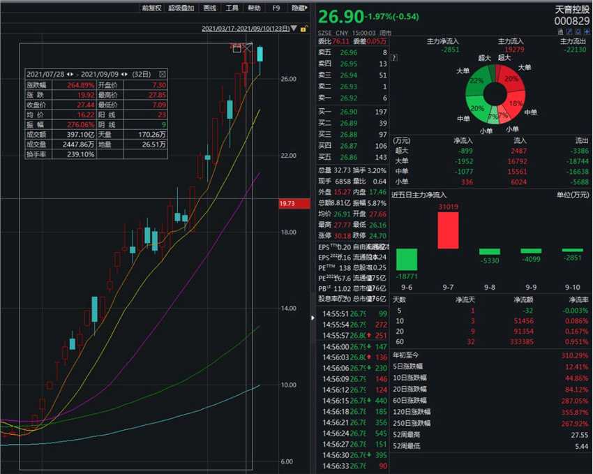 天音控股(000829),7月底開始,從7.32元/股,漲到了26.9元/股,短短一個多月莫名其妙漲了近三倍,市值漲了超200億!
