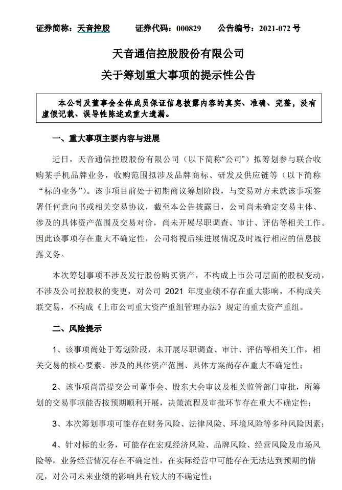 天音控股:擬籌劃參與聯(lián)合收購某手機品牌業(yè)務