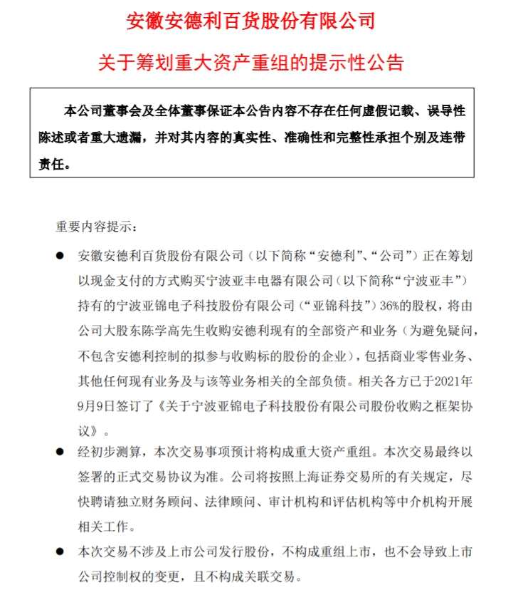 9月9日晚,A股百貨上市公司安德利宣布,正在籌劃以現(xiàn)金支付的方式購(gòu)買(mǎi)寧波亞豐持有的新三板公司亞錦科技36%的股權(quán),股權(quán)轉(zhuǎn)讓價(jià)款暫定為不低于24億元。其中,18億元由安德利或其控制的企業(yè)以現(xiàn)金方式向?qū)幉▉嗀S支付,其余交易對(duì)價(jià)由公司大股東陳學(xué)高代安德利支付。標(biāo)的股份過(guò)戶(hù)后,寧波亞豐應(yīng)將其持有的5.63億股股份(占亞錦科技總股本的15%)對(duì)應(yīng)的表決權(quán)不可撤銷(xiāo)地委托給安德利行使。