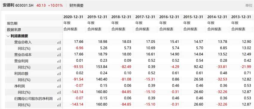 業(yè)績(jī)方面,2020年,亞錦科技實(shí)現(xiàn)營(yíng)業(yè)收入33.74億元,凈利潤(rùn)5.66億元;今年上半年?duì)I收、凈利分別為19.22億元、4.29億元。安德利自上市以來(lái)凈利潤(rùn)從未超過(guò)6000萬(wàn)元,去年和今年上半年處于虧損狀態(tài)。