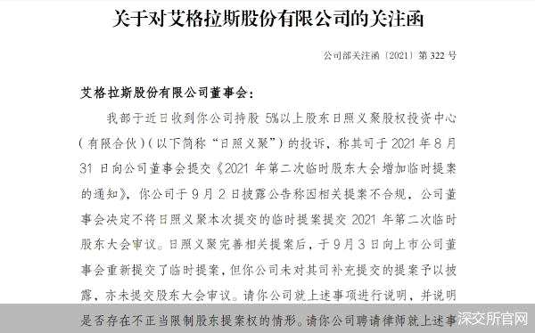 深交所官網(wǎng)顯示,深交所于近日向*ST艾格下發(fā)了關(guān)注函。在關(guān)注函中,深交所稱收到*ST艾格持股5%以上股東日照義聚的投訴。日照義聚表示,先后兩次向*ST艾格董事會(huì)提交臨時(shí)提案,但第一次公司稱相關(guān)提案不合規(guī),第二次補(bǔ)充提交后公司并未予以披露,亦未提交股東大會(huì)審議。深交所要求*ST艾格就上述事項(xiàng)進(jìn)行說(shuō)明,并說(shuō)明是否存在不正當(dāng)限制股東提案權(quán)的情形。