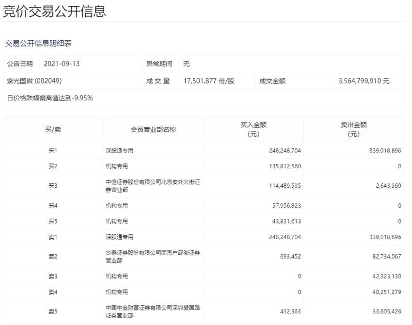 紫光國微跌停 深股通買入2.48億元并賣出3.39億元 三機構(gòu)合計買入2.38億元