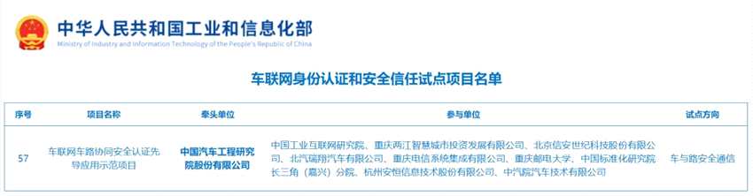 該項(xiàng)目聯(lián)合了中國(guó)工業(yè)互聯(lián)網(wǎng)研究院、重慶兩江智慧城市投資發(fā)展有限公司、北京信安世紀(jì)科技股份有限公司、北汽瑞翔汽車(chē)有限公司、重慶電信系統(tǒng)集成有限公司、重慶電信系統(tǒng)集成有限公司、重慶郵電大學(xué)、中國(guó)標(biāo)準(zhǔn)化研究院長(zhǎng)三角(嘉興)分院、杭州【安恒信息(688023)、股吧】技術(shù)股份有限公司、中汽院汽車(chē)技術(shù)有限公司等單位,共同開(kāi)展“車(chē)與路安全通信”示范應(yīng)用,具有良好的“產(chǎn)-學(xué)-研-用-管”合作基礎(chǔ),聚集了政府監(jiān)管部門(mén)、主機(jī)廠、城市發(fā)展建設(shè)、網(wǎng)絡(luò)安全公司、科研機(jī)構(gòu)和高校等多家在汽車(chē)、互聯(lián)網(wǎng)、安全行業(yè)的知名企業(yè)和單位。