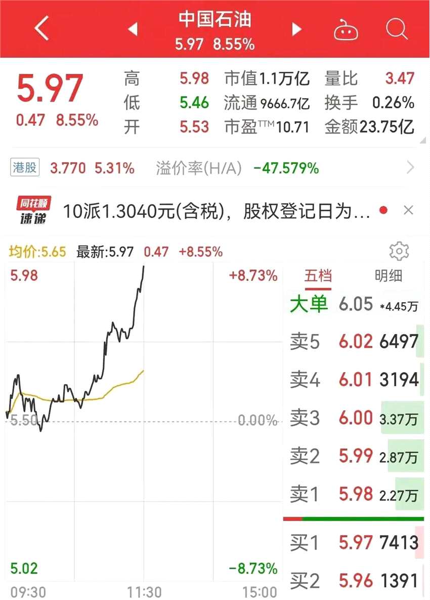 A股上海石化(600688)、洲際油氣(600759)漲停,中國石油(601857)漲8.55%,泰山石油(000554)漲6.2%,中國石化漲4%;港股中國石油漲5%,中海油和中石化漲超1%。