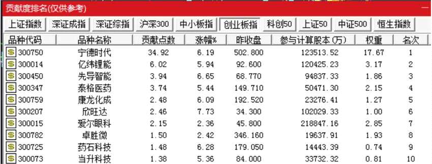創(chuàng)業(yè)板指貢獻(xiàn)點(diǎn)數(shù)前十股