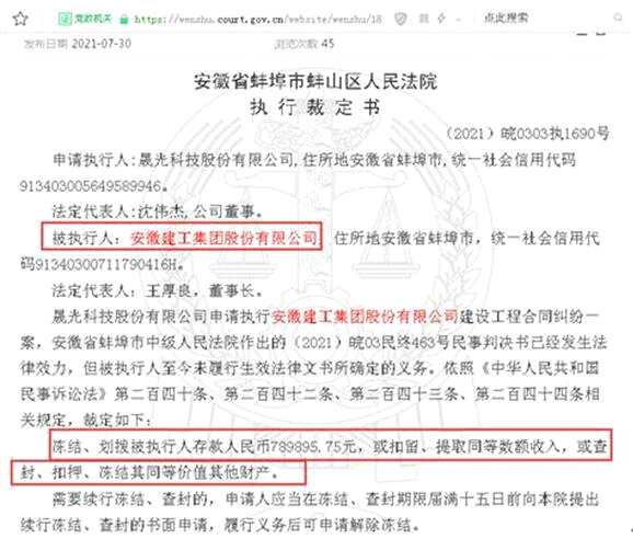 其中,(2021)皖0303執(zhí)1690號案件,即《晟光科技股份有限公司、安徽建工集團股份有限公司建設(shè)工程合同糾紛執(zhí)行實施類執(zhí)行裁定書》顯示,晟光科技股份有限公司申請執(zhí)行安徽建工集團股份有限公司建設(shè)工程合同糾紛一案,安徽省蚌埠市中級人民法院作出的(2021)皖03民終463號民事判決書已經(jīng)發(fā)生法律效力,但被執(zhí)行人至今未履行生效法律文書所確定的義務(wù)。依照《中華人民共和國民事訴訟法》第二百四十條、第二百四十二條、第二百四十三條、第二百四十四條相關(guān)規(guī)定,裁定如下:凍結(jié)、劃撥被執(zhí)行人存款人民幣789895.75元,或扣留、提取同等數(shù)額收入,或查封、扣押、凍結(jié)其同等價值其他財產(chǎn)。