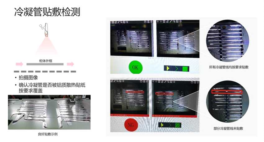 拿上面提到的冷柜工廠為例,其客戶很多來自海外,高度重視安全合規(guī),不僅要求環(huán)保安全標(biāo)簽要貼對,而且還不能歪斜、脫落、翹起??咳斯頇z測不僅費時、費力、費錢,而且還容易出錯,對于混流生產(chǎn)模式的工廠更是加大了檢測的難度。冷凝管貼敷環(huán)節(jié)的質(zhì)量檢測,直接影響產(chǎn)品的制冷問題,影響客戶的體驗。在這些方面,昇騰智造都可以大顯身手。