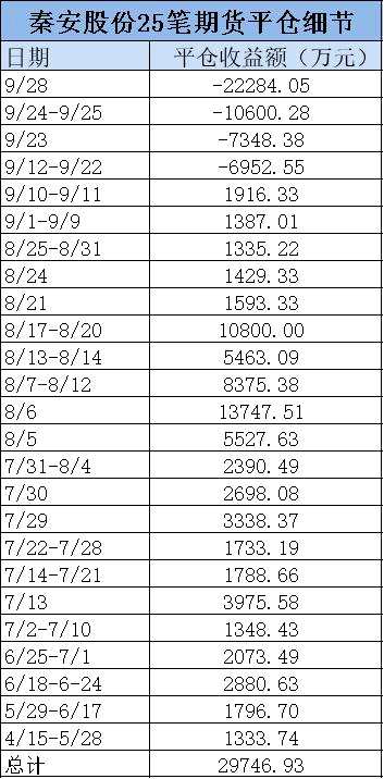 值得一提的是,截至9月25日收盤,秦安股份期貨賬戶浮虧2.33億元。若平倉虧損再加上賬戶浮虧,這些虧損已接近其全部盈利。