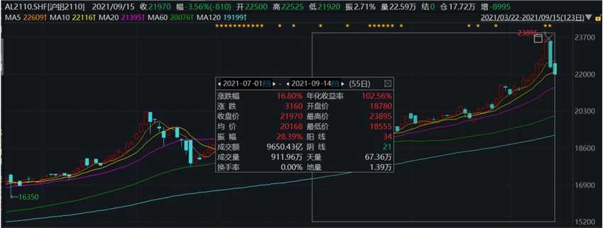 而滬鋁自7月份以來,一直都是上升趨勢(shì),截至13日,滬鋁的漲幅一度接近30%,但是沒想到13日夜盤,滬鋁大跌,截至收盤,暴跌4.49%。