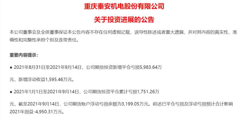 9月15日晚間,【秦安股份(603758)、股吧】(603758)發(fā)布公告稱,2021年8月31日至2021年9月14日,公司期貨投資新增平倉虧損5983.64萬元,新增浮動(dòng)收益1595.46萬元。