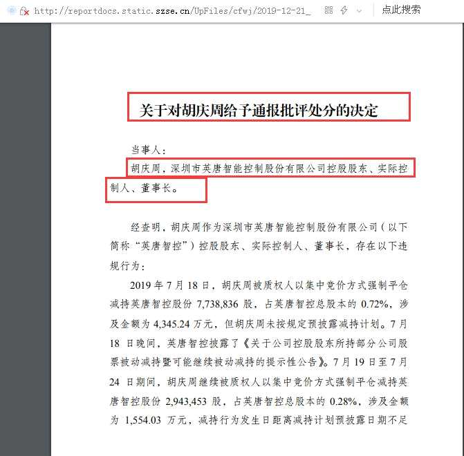 據(jù)深交所2019年披露的《關(guān)于對胡慶周給予通報批評處分的決定》,經(jīng)查明,胡慶周作為深圳市英唐智能控制股份有限公司(以下 簡稱“英唐智控”)控股股東、實際控制人、董事長,存在違規(guī)行為。