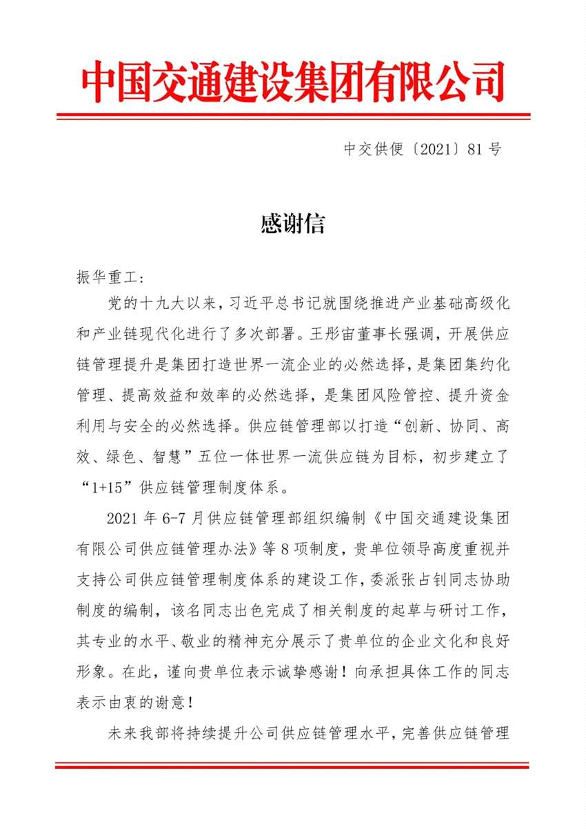 9月15日,中交集團(tuán)供應(yīng)鏈管理部發(fā)來感謝信,信中對(duì)公司高度重視并支持中交集團(tuán)供應(yīng)鏈管理制度體系建設(shè)工作,以及承擔(dān)具體工作人員的出色表現(xiàn)表示感謝。