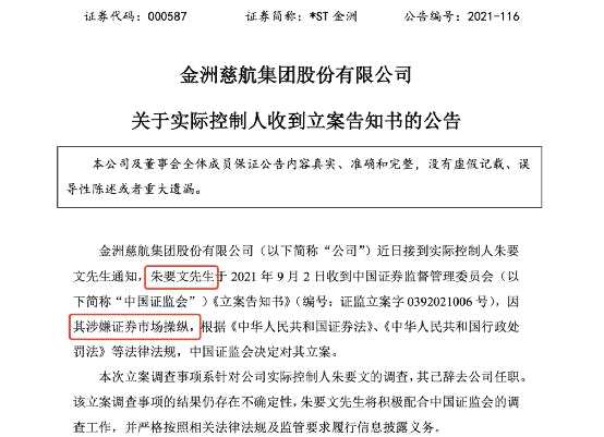 9月17日晚間,【*ST金洲(000587)、股吧】(000587)公告稱,公司于2021年收到中國證監(jiān)會《立案告知書》(編號:證監(jiān)立案字0392021017號),因公司涉嫌信息披露違法違規(guī),根據(jù)相關法律法規(guī),中國證監(jiān)會決定對公司立案。