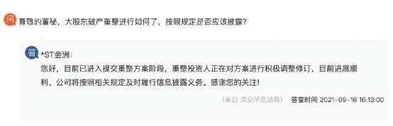 9月16日下午,*ST金洲董秘在深交所互動易中表示,公司目前已進入提交重整方案階段,重整投資人正在對方案進行積極調(diào)整修訂,目前進展順利。公司將按照相關規(guī)定及時履行信息披露義務。