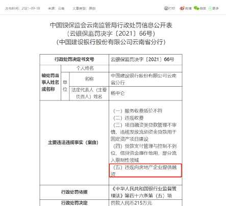 又有銀行因違規(guī)向房企提供融資被罰。9月18日,中國銀保監(jiān)會云南監(jiān)管局開出一張罰單,中國建設(shè)銀行(601939)云南省分行因違規(guī)向房地產(chǎn)企業(yè)提供融資等原因,被罰215萬。