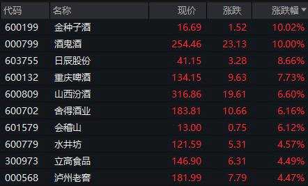 中秋節(jié)前的最后一個(gè)交易日(9月17日), 白酒股大幅拉升,截至收盤,【金種子酒(600199)、股吧】(600199)、酒鬼酒(000799)漲停,山西汾酒(600809)、舍得酒業(yè)(600702)漲超6% ,貴州茅臺(tái)(600519)漲近3% 。