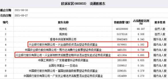 其中,興業(yè)銀行股份有限公司-興全趨勢投資混合型證券投資基金的持股數(shù)量為837.69萬股,占流通股比例為1.382%,是歐派家居的第四大流通股東。該基金由董承非、童蘭共同管理。
