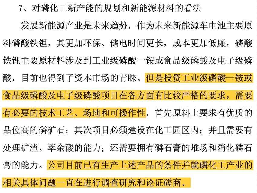 在9月2日的機(jī)構(gòu)調(diào)研中,司爾特相關(guān)負(fù)責(zé)人就透露稱,公司已經(jīng)具備了生產(chǎn)工業(yè)級(jí)磷酸一銨或食品級(jí)磷酸及電子級(jí)磷酸的條件。