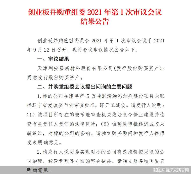 9月22日晚間,據深交所官網披露的創(chuàng)業(yè)板并購重組委2021年第1次審議會議公告顯示,同意利安隆發(fā)行股份購買資產,這意味著利安隆籌劃數月的重組順利過關。