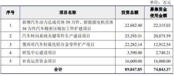嶸泰股份2月2日發(fā)布的招股說明書顯示,扣除發(fā)行費用后的實際募集資金凈額擬分別投資于以下項目:新增汽車動力總成殼體39萬件、新能源電機殼體38萬件汽車精密壓鑄加工件擴建項目;汽車轉向系統(tǒng)關鍵零件生產建設項目;墨西哥汽車輕量化鋁合金零件擴產項目;研發(fā)中心建設項目;補充運營資金項目。