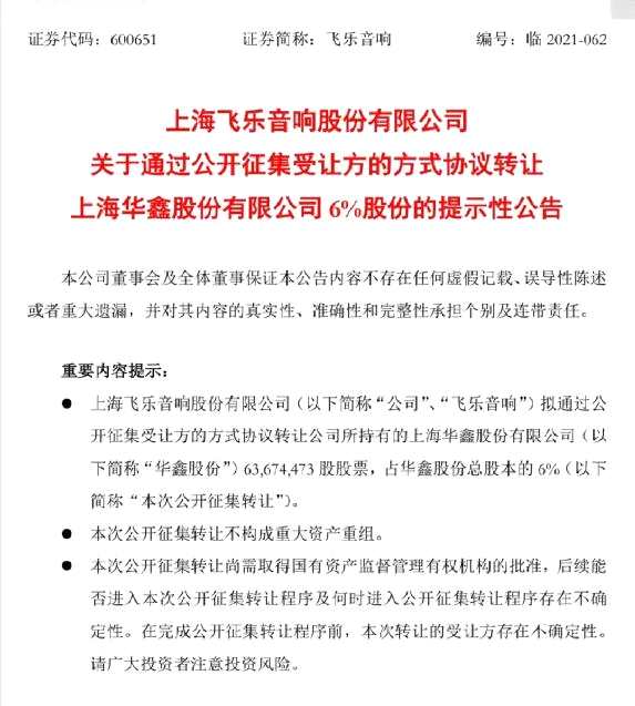 9月23日晚間,【華鑫股份(600621)、股吧】(600621)和飛樂音響(600651)同時公告,作為華鑫股份第三大股東的飛樂音響,擬通過公開征集受讓方的方式協(xié)議轉(zhuǎn)讓所持6%的全部華鑫股份股權(quán)。