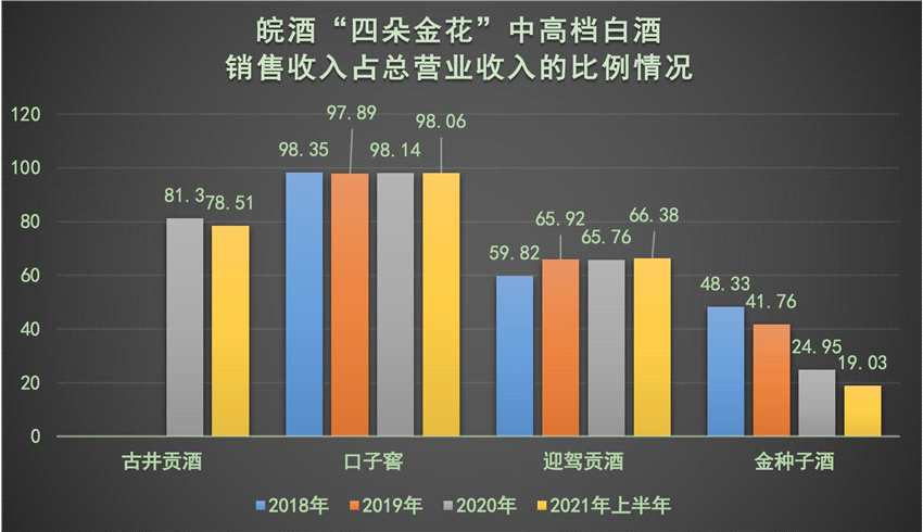 從內部看,“二八效應”明顯,皖酒霸主古井貢酒一家獨大。以2021年上半年經營情況為例,古井貢酒以70.07億元營業(yè)收入、13.79億元凈利潤位列第一;第二和第三的口子窖、迎駕貢酒,上半年營業(yè)收入僅為古井貢酒的三分之一,凈利潤亦隨之腰斬;更別提近年來長期虧損的金種子酒了。