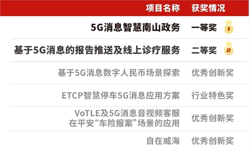 除一、二等獎(jiǎng)外,夢(mèng)網(wǎng)科技與合作伙伴聯(lián)合申報(bào)的參賽項(xiàng)目也獲得了1個(gè)行業(yè)特色獎(jiǎng)與3個(gè)優(yōu)秀創(chuàng)新獎(jiǎng)的好成績(jī)。支持一站式停車服務(wù)直達(dá),為用戶提供全場(chǎng)景多方位運(yùn)營(yíng)的“ETCP智慧停車5G消息應(yīng)用方案”獲行業(yè)特色獎(jiǎng);實(shí)現(xiàn)了chatbot實(shí)時(shí)交互技術(shù)、VoLTE音視頻技術(shù)與車險(xiǎn)業(yè)務(wù)系統(tǒng)深度融合的“公共服務(wù)-深圳 平安通信科技-平安產(chǎn)險(xiǎn)”參賽項(xiàng)目獲優(yōu)秀創(chuàng)新獎(jiǎng);同獲優(yōu)秀創(chuàng)新獎(jiǎng)的還有創(chuàng)新了數(shù)字人民幣應(yīng)用邊界的“基于5G消息數(shù)字人民幣場(chǎng)景探索”項(xiàng)目,以及致力于推動(dòng)文旅領(lǐng)域移動(dòng)化、可視化、數(shù)字化、智能化的“自在威海”項(xiàng)目。