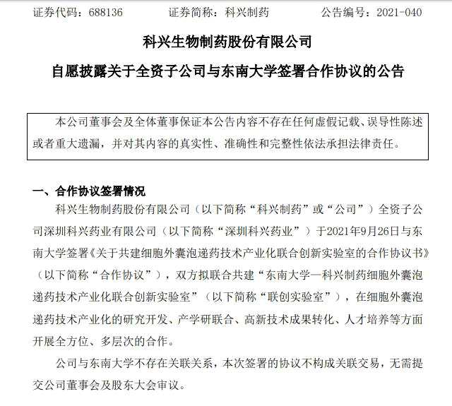 2021年9月27日,科興制藥發(fā)布《自愿披露關(guān)于全資子公司與東南大學(xué)簽署合作協(xié)議的公告》,此前一天,該公司全資子公司深圳科興藥業(yè)與東南大學(xué)簽署《關(guān)于共建細胞外囊泡遞藥技術(shù)產(chǎn)業(yè)化聯(lián)合創(chuàng)新實驗室的合作協(xié)議書》(簡稱《合作協(xié)議》),雙方擬聯(lián)合共建“東南大學(xué)-科興制藥細胞外囊泡遞藥技術(shù)產(chǎn)業(yè)化聯(lián)合創(chuàng)新實驗室”(簡稱聯(lián)創(chuàng)實驗室)。