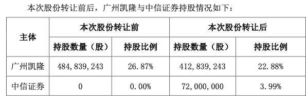 轉(zhuǎn)讓前,廣州凱隆合計持有嘉凱城 26.87%股份;若轉(zhuǎn)讓得以進行,則廣州凱隆的持股比例將降至22.88%;中信證券則首次列席嘉凱城股東行列,持股比例為3.99%。