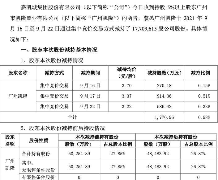 之后在9月23日,嘉凱城再公告,廣州凱隆于9月16日至9月22日通過集中競價交易方式減持了約 1770.9萬股股份,對應(yīng)減持比例為0.98%;減持后,對公司的持股比例降至26.87%。