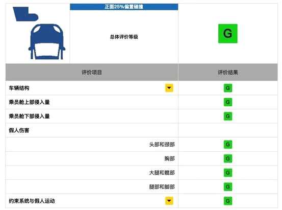 C-IASI的測試結(jié)果:車內(nèi)乘員安全指數(shù)(正面25%偏置碰撞、側(cè)面碰撞、車頂強度、座椅/頭枕)、車外行人安全指數(shù)、車輛輔助安全指數(shù)三大項均獲得G(優(yōu)秀)成績,是新能源轎車中的最好成績。