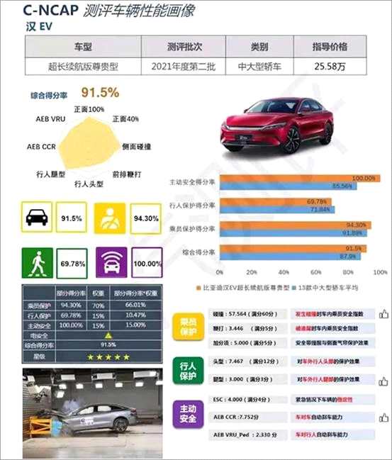 C-NCAP的測試結(jié)果:完全正面碰撞試驗得分19.124分(得分率95.62%),正面40%偏置碰撞試驗得分18.440分(得分率92.20%),側(cè)面碰撞試驗得分20.000分(得分率100.00%),乘員保護評價得分66.010分(得分率94.30%),主動安全評價得分15.000分(得分率100%)。最終,比亞迪漢以91.5%的綜合得分率榮獲C-NCAP五星級安全認證,在新能源轎車中排名第一。