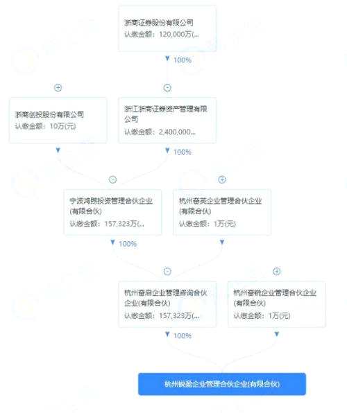 由于是一家新注冊公司,網(wǎng)絡上并沒其相關資料和官網(wǎng)。通過股權關系的穿透,記者發(fā)現(xiàn),上市公司浙商證券(601878.SH)通過四層股權關系(浙商證券控股浙商證券資管,浙商證券資管控股鴻煦投資,鴻煦投資控股杭州奮啟,杭州奮啟控股杭州奮銳),是杭州奮銳的最終控制人。