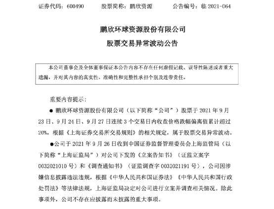 9月27日晚間,鵬欣資源(600490)發(fā)布公告稱,公司于2021年9月26日收到中國證監(jiān)會(huì)上海監(jiān)管局(以下簡稱“上海證監(jiān)局”)對(duì)公司下發(fā)的《立案告知書》和《調(diào)查通知書》,公司因涉嫌信息披露違法違規(guī),根據(jù)相關(guān)法律法規(guī),上海證監(jiān)局決定對(duì)公司進(jìn)行立案并調(diào)查相關(guān)情 況。