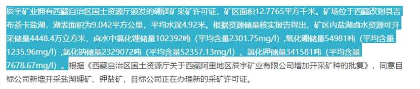 中證君注意到,該公告同樣約定,辰宇礦業(yè)表層鹵水鋰儲(chǔ)量10萬余噸(已探明),地下淺層鹵水鋰儲(chǔ)量約20萬噸(以實(shí)際探明儲(chǔ)量為準(zhǔn)),正在辦理采礦權(quán)證。