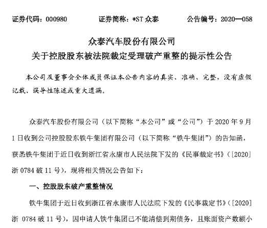 壓垮眾泰的最后一根稻草是母公司鐵牛集團(tuán)宣布破產(chǎn)。2020年9月1日,眾泰發(fā)布公告稱,母公司鐵牛集團(tuán)因不能清償?shù)狡趥鶆?wù),且賬面資產(chǎn)數(shù)額小于負(fù)債數(shù)額,鐵牛集團(tuán)申請破產(chǎn)重整。同時,鐵牛集團(tuán)違規(guī)占款眾泰3億元資金,眾泰債務(wù)問題雪上加霜。