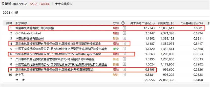 雖然即將迎來解禁大利空,從金龍魚首度發(fā)布的定期報告2020年年報至今,知名私募林園投資就現(xiàn)身金龍魚前十大流通股東,也就是從去年10月上市后就開始買入,到今年二季度末,林園3只產(chǎn)品持倉市值超3億元。