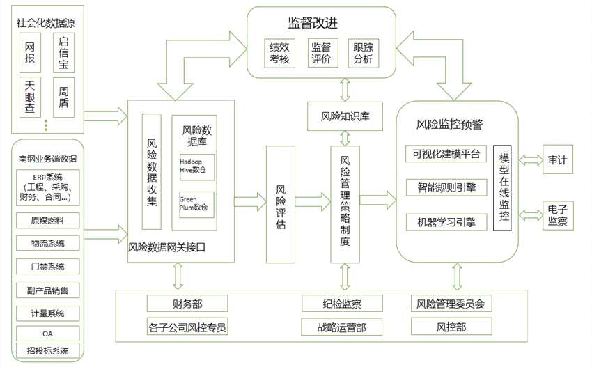 南鋼智慧風(fēng)控管理充分依托南鋼采購(gòu)招標(biāo)系統(tǒng)、生產(chǎn)管理系統(tǒng)、銷售管理系統(tǒng)、財(cái)務(wù)管理系統(tǒng)、合同管理系統(tǒng)等信息系統(tǒng),以及外部數(shù)據(jù)資源,在大數(shù)據(jù)Hive數(shù)據(jù)倉(cāng)庫(kù)基礎(chǔ)上,構(gòu)建貫穿“風(fēng)險(xiǎn)信息收集、風(fēng)險(xiǎn)評(píng)估、風(fēng)險(xiǎn)管理策略制定、風(fēng)險(xiǎn)應(yīng)對(duì)與解決、監(jiān)督與改進(jìn)”一體化的“智慧風(fēng)控云平臺(tái)”。